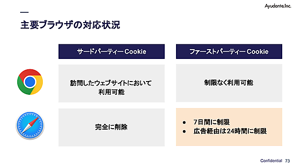 クッキーには次の2種類があり、ブラウザごとに規制状況が異なる: