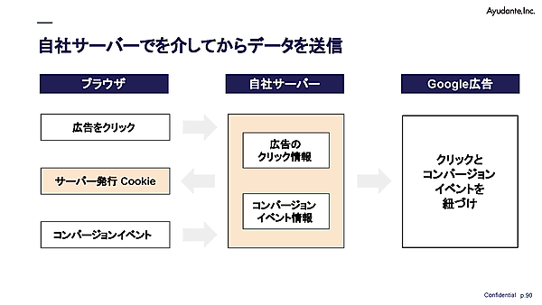 サーバー発行クッキーで補完するものとしては、Googleの「サーバーサイドGTM(Googleタグマネージャー)」、Metaの「コンバージョンAPI」があり、自社の計測用サーバーを立てて、サーバー発行クッキーを発行するという方法をとる。