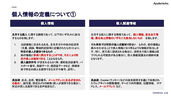 Eメールアドレス単体は本来「個人関連情報」に分類されるが、「takumi.shakuya@〜」のように名前がそのまま入っているといったケースや、個人情報と「容易照合性」がある場合は個人情報に格上げされるため、実務上はほぼ個人情報として扱うべきだと杓谷氏は指摘する。