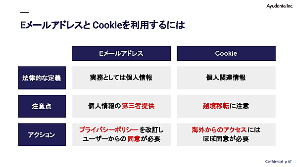後半は、アユダンテの杓谷氏が、「ブラウザのクッキー規制」「それに対抗するソリューション」「実装に不可欠な法的知識」という3つのトピックに沿って解説した。