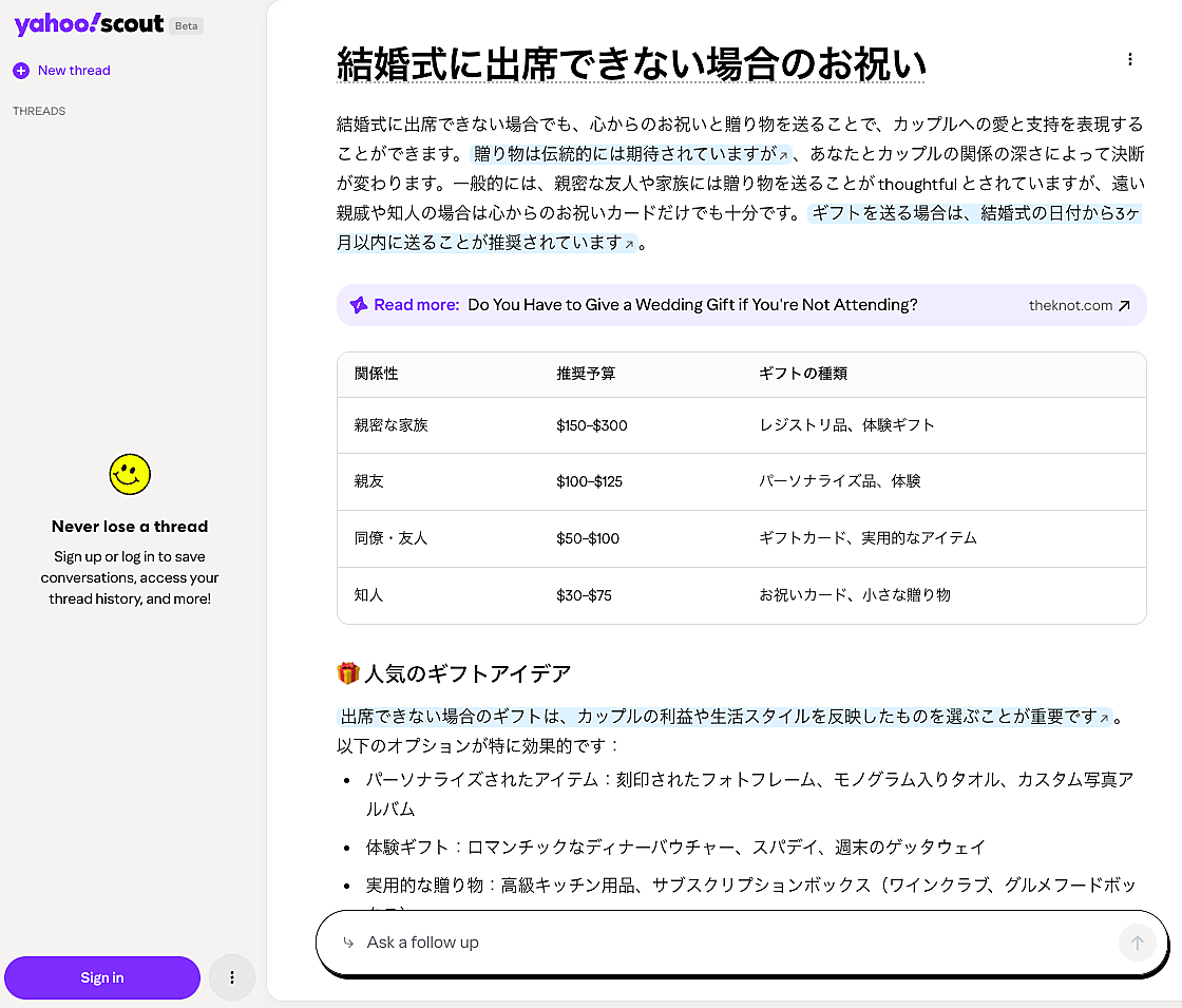 日本のヤフーも「AIアシスタント」というAIツールを提供しているが、米ヤフーのYahoo Scoutはまったく別プロダクトだ。Yahoo Scoutは、主要な基盤モデルとして、AnthropicのClaudeとMicrosoft Bingのgrounding APIとの提携で構築されている。