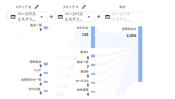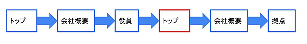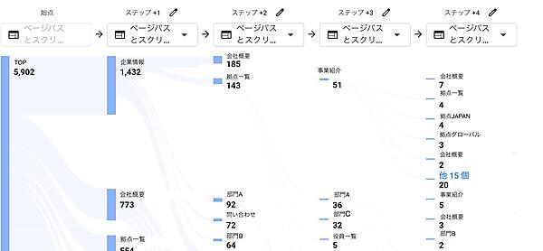 このように整理すると、「拠点一覧」や「部門」までアクセスしたにもかかわらず、その後に「会社概要」へ戻るケースが多いことがわかります。