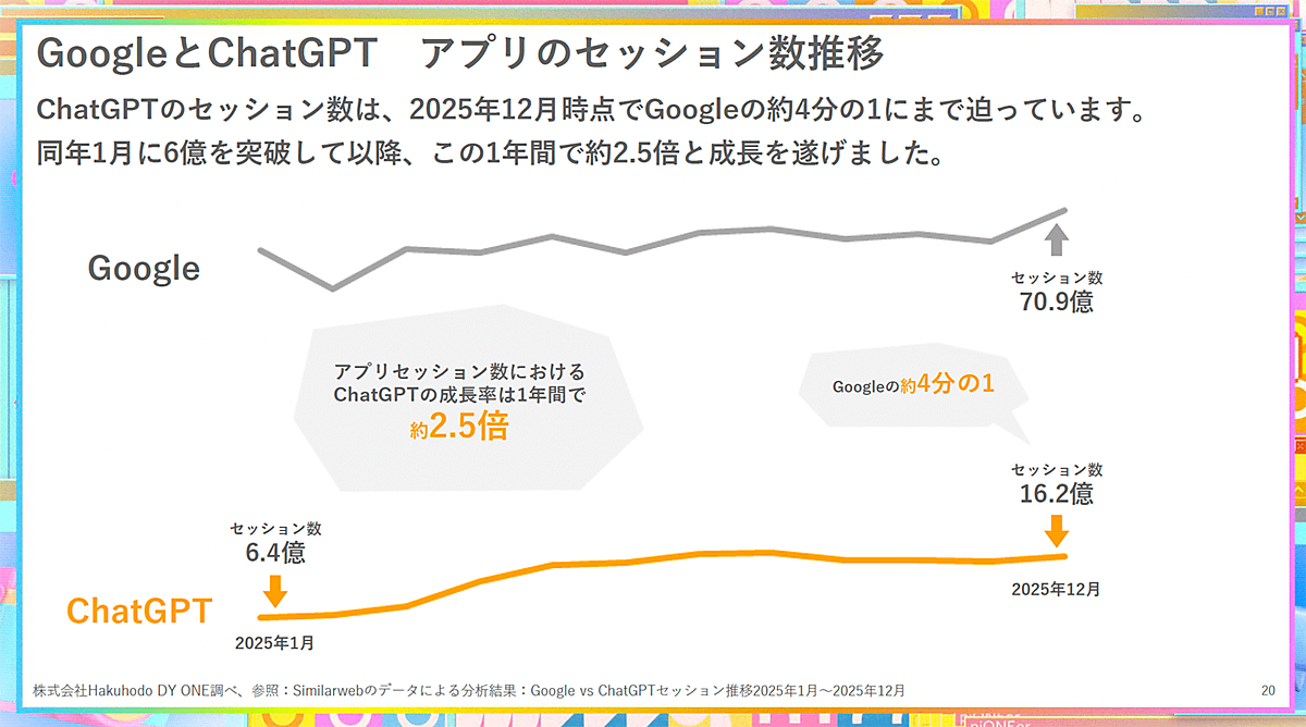 AI検索の利用状況については、Webブラウザでは従来型検索が96%を占めている一方で、アプリでは従来型検索が70.9%、ChatGPTが16.2%となっている。セッション数についても、ChatGPTは2025年1月の6億から、12月には16億と2.5倍に増加している。