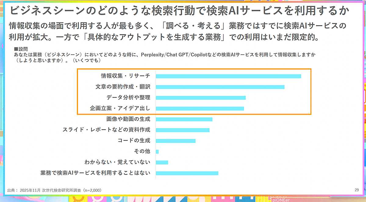 ビジネスシーンでは、「情報収集・リサーチ」が最も多かった。加えて、データ分析・整理、企画立案・アイデア出しなど、考える業務でも使われていることがわかった。また、文章要約・作成、翻訳といったテキストのアウトプット制作にも活用されている。一方で、画像や動画生成、スライド作成、コード生成などは現時点での利用は低い水準となっている。