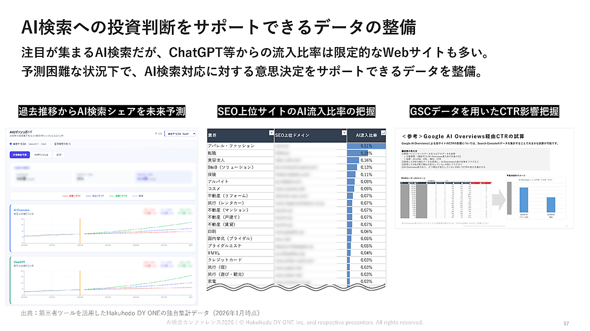 AI検索シェアの未来予測、SEO上位サイトのAI流入比率、Search Consoleを用いたCTRへの影響などを定点観測している。その他、AI Overviewsの表示内容の分析、引用URLと検索表示順位の関係などを調査し、AIO投資への戦略判断の根拠を可視化している。