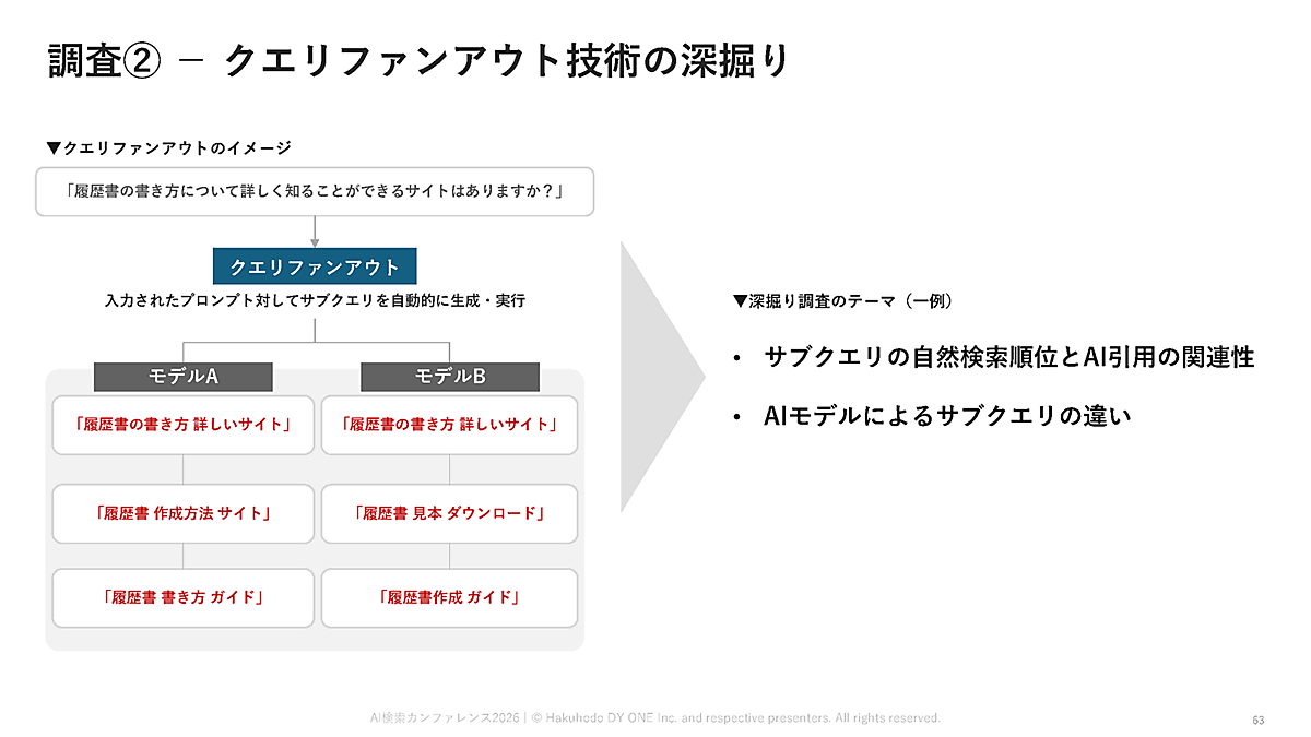 力を入れているのはクエリファンアウト(Query Fanout)の深掘りだ。クエリファンアウトとは、ユーザーが入力したプロンプトから、AIが複数の検索用サブクエリを自動生成して、並列検索を行う仕組みを指す。