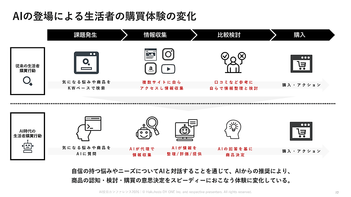 毛利氏は、日本国内においてAI検索上で決済まで完結する文化が浸透するかは不透明としながらも、「購買の検討や比較フェーズにおいては、生成AIの活用が進むだろう」と予測した。