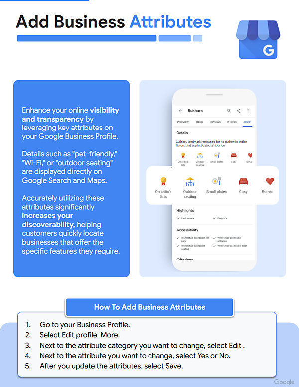 - 「ペット同伴可」「Wi-Fi完備」「テラス席あり」「車椅子対応」などの特徴を明示することで、検索での関連性が高まり、顧客が自分のニーズに合うビジネスをすぐに見つけやすくなる