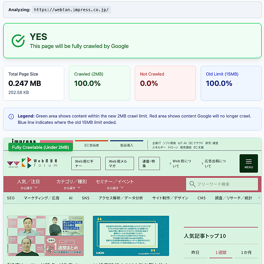 とはいえ、前回も触れたように大多数のサイトでHTMLが2MBを超えることはない。ブラウザのデベロッパーツールでファイルサイズを調べる方法も教えたが、こちらのツールを使えば簡単にHTMLサイズを計測できる。