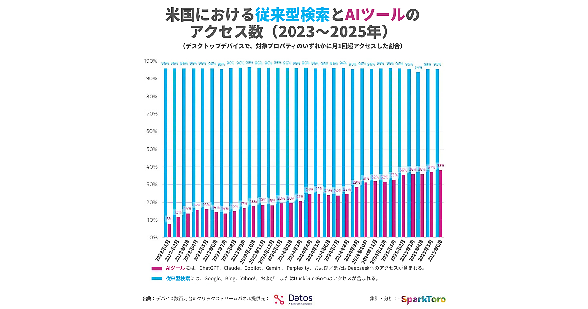 ほとんどの人はグーグルでの検索に慣れている。実際、SparkToroの最近の調査によると、AIが台頭している状況でもグーグルでの検索ボリュームは減少していない。人々はChatGPTなどのLLMを「代替手段」ではなく「追加のツール」として取り入れている。