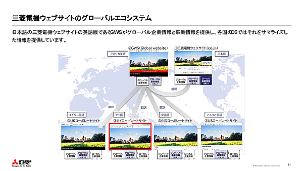 では、実際にどんなCSができあがったのか。いわゆる“三菱電機のWebサイト”はco.jpドメイン、かつ日本語表記で運用されている。事業情報など膨大な量のコンテンツが内包されており、これらを一部要約・英語翻訳するかたちでグローバルWebサイト(GWS)が構築された。