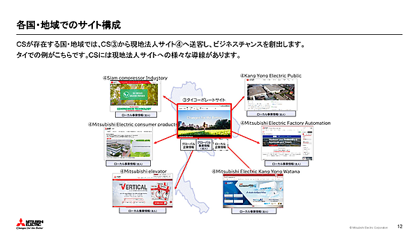 たとえばタイの場合、GWSをタイ語に翻訳したタイCSが存在する。これが中心拠点となる「ハブ」にあたる。そこからさらに、エレベーター、空調、FAなどを手掛ける企業・事業ごとの独自サイト「BU(Business Unit)サイト」が、周辺拠点つまり「スポーク」的な位置付けで展開される。ハブとスポークは連携しており、それぞれの間で“送客”が発生する。これがビジネスチャンスを生むきっかけになると粕谷氏は語る。