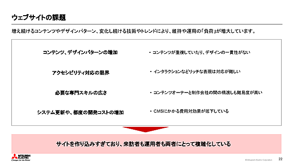 三菱電機グループは巨大なだけに、社内のサイトオーナーの数は多く、それぞれ違う悩みを抱えている。代表的な悩みは、次の3つだ: