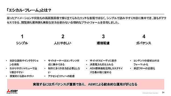 リニューアルに際してのコンセプトは、「エシカル・フレーム」とした。エシカルとは倫理的・道徳的などを意味する言葉だ。粕谷氏によれば「多様なステークホルダーに対応して、それぞれの方々にとって無駄な労力を使わない合理的なサイトを作る」という姿勢を強くアピールすることが狙いだった。