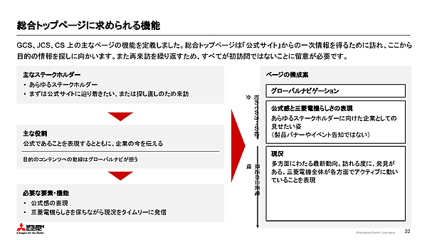 これらの結果を踏まえ、CSのトップページの役割を再定義した。間違いなく三菱電機であり、その一次情報が集積されていると一目でわかる“公式感”を重視した。また、日々の部品発注などのためにくり返しサイトを訪問するステークホルダーもいることから、最新の情報をわかりやすく記載するという方針も重視された。