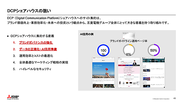 目標は「三菱電機グループ全サイトの統合」「マシン(AI)リーダブル対応」だ。全サイトを統一的に管理できれば、ブランドとしてのガバナンスはより強化される。そして、AEMが得意とするコンポーネント型のサイト開発が進めば、記述された内容をAIが分析しやすくなる。翻訳作業などはAIによって特に効率化できる可能性が高いだけに、AI対応への期待は膨らむ。