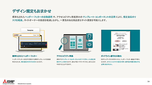 デザイン規定に関する煩雑な作業も必要がなくなる。これまで、サイト作成時にはページのヘッダーおよびフッターに規定があり、必要に応じて社内審査を受ける必要があった。これが、あらかじめ用意されたテンプレートを使用すれば、その審査の手間がなくなる。視覚・聴覚障害者への配慮としてのアクセシビリティにも容易に適合できる。