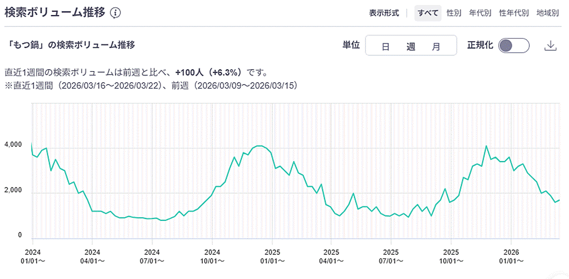 他にも、「店名」「食材」「メニュー名」「地域」といったキーワード検索から、店舗のターゲット層の分析や関連ニーズの把握(インサイト調査)などが行われています。さらにキーワードを追加し、検索人数や年齢層の増減まで確認しています。ゆくゆくはそこからヒットメニューが出てくることを期待しています。