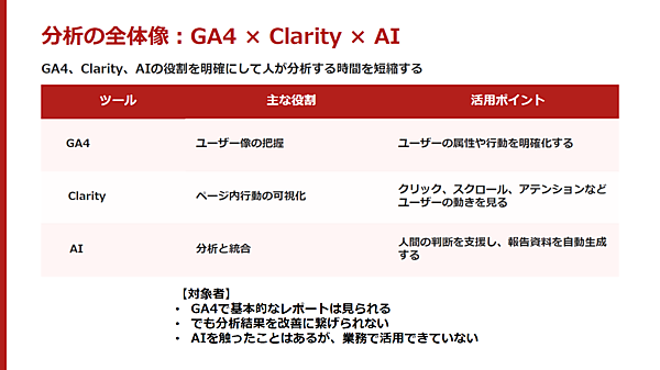 冒頭で森野氏は、GA4、Clarity、AIの役割を次のように整理した。