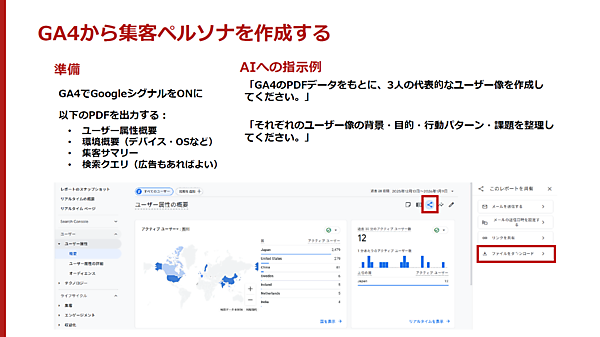 GA4のデータやWebサイト、お客様の声のデータをAIに渡し、ペルソナを作る