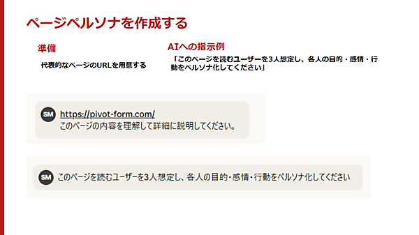 代表的なページのURLをAIに渡し、「このページの内容を理解して詳細に説明してください」と指示し、AIに内容を理解してもらう。理解に問題がなければ、次に「このページを読むユーザーを3人想定し、各人の目的・感情・行動をペルソナ化してください」と指示する。そうするとページを読むユーザー像が浮かび上がる。ポイントは、トップページやランディングページなどユーザーにとって参考になる情報が多く載っているページをAIに渡すことだ。