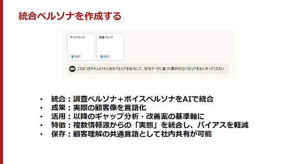 統合ペルソナは、調査ペルソナとボイスペルソナのファイルをAIに読み込ませ、「この2つのドキュメントにあるペルソナを総合して、定性データに基づく最終的なペルソナを3人作ってください」と指示して作成する。