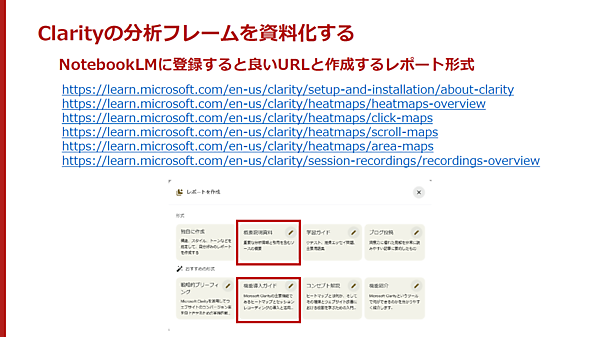 まずは、NotebookLMにClarity公式ヘルプやFAQ、用語集やデータ仕様ページのURLを登録し、NotebookLMにClarityについて理解させる。