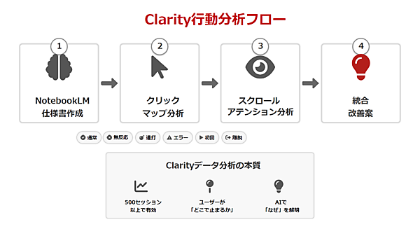 分析用ドキュメントができたら、Clarityのデータを使ってAIで行動分析を進めていく。森野氏はClarityの行動分析フローとして以下の図を示した。