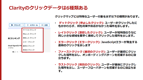 分析方法を紹介する前に、森野氏はClarityのクリックデータについて解説した。データは6種類あり、詳細は以下の図を確認して欲しい。