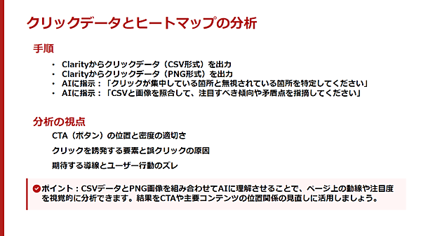 ClarityのCSVのデータをアップし、「ヒートマップのCSVです。このデータからわかることを教えてください」とAIに指示する。次にPNGのデータをアップし、「こちらは実際のヒートマップの画像です。これらから追加でわかることがあれば教えてください」「CSVと画像(PNG)からわかったことのシンプルな統合版を作ってください。改善案などは不要です。読み取れる事実だけをまとめてください」と順に指示していくと、クリック分析ができあがる。