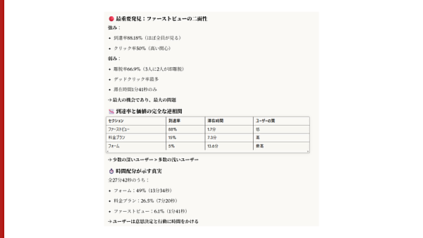 続いて、スクロールとアテンションのCSV・PNGデータをAIに追加で読み込ませる。「スクロールとアテンションのCSVデータ、画像データです。追加で分かることがあれば教えてください」とAIに指示する。最後に、「クリック分析とスクロール&アテンションマップ分析から分かることを統合したものを作成してください」と指示すると、AIが次の図のようなヒートマップ分析レポートを出してくれる。