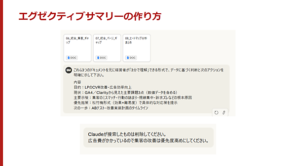 「これら3つのドキュメントをもとに経営者が“3分で理解”できる形式で、データに基づく判断と次のアクションを明確に示してください」「Claude(または使用しているAI名)が創作したものは削除してください」とAIに指示する。「広告費がかかっているので集客の改善は優先度高めにしてください」といった重みづけをすると、出力する内容が変わってくる。