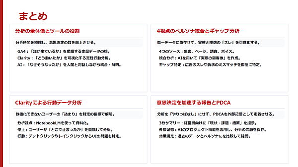 森野氏は、AIを外部記憶装置として活用することをおすすめする。特に、ClaudeやChatGPTにあるチャットをまとめられる“プロジェクト”は便利だと語り、関係するものはプロジェクトにまとめておくのがよいという。ペルソナ、ギャップ分析、Clarity分析をすべてAIに保存しておけば、半年後の比較検証も楽にできる。森野氏は講演内容を以下の図にまとめ、講演を終えた。