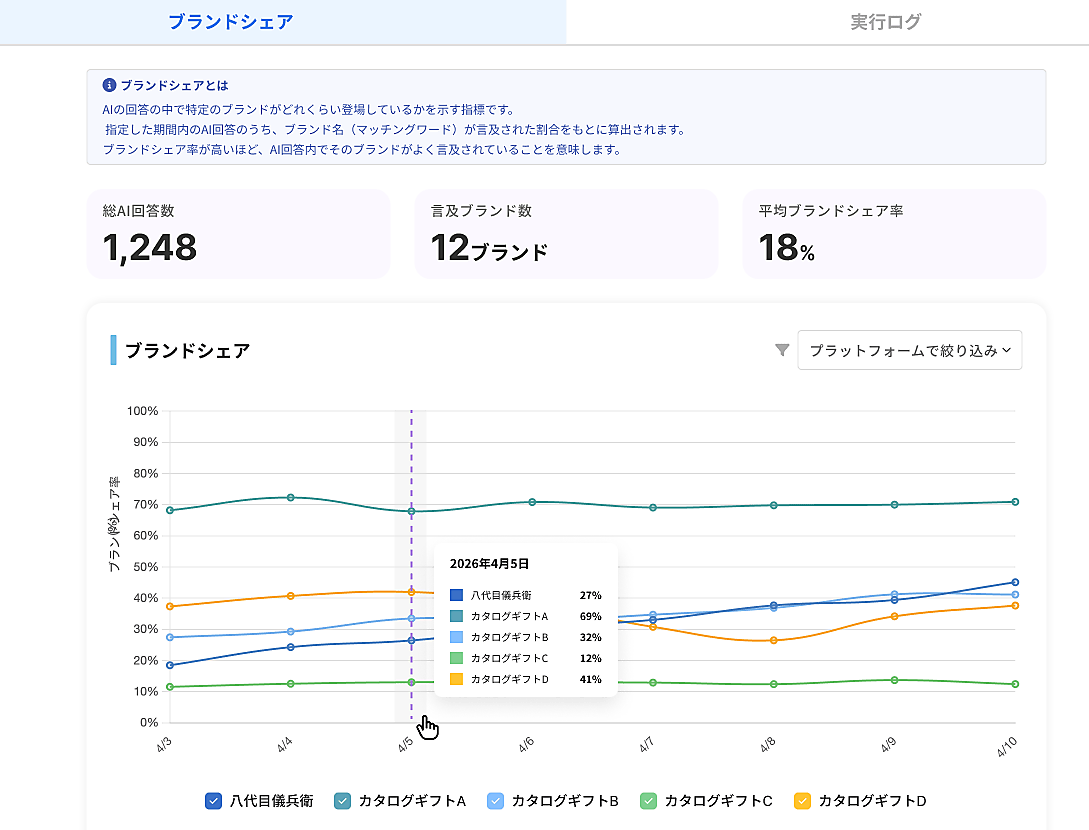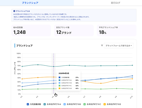 さて、今回、八代目儀兵衛が最初の一歩として行ったのが「現状把握」だ。Faber Companyが提供する「ミエルカGEO」なら、ChatGPTやGemini、AI Overviewsにおける自社の露出状況を計測できる。