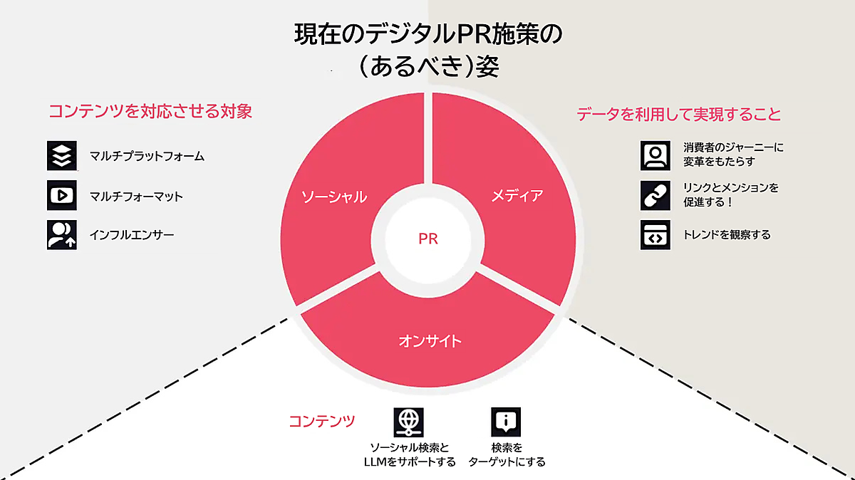 施策はもはや、「メディアに記事を投げかけて反応を見る」ようなものであってはならない。確かに高品質なリンクを獲得する必要はある。しかし、ゼロクリック検索の台頭に対抗するには、LLMやソーシャルプラットフォームもターゲットにする必要がある。