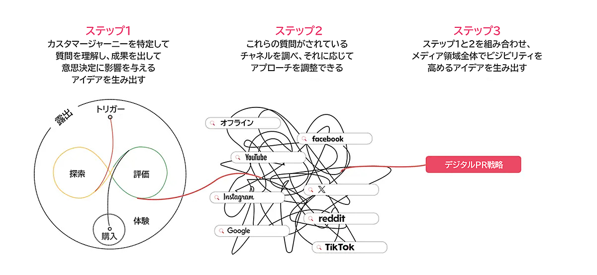「メディア」「ソーシャルプラットフォーム」「AI検索」に有効な方法でユーザーの「質問」に一貫して回答できれば、施策が真に関連していることを確信できる。さらに重要なこととして、リンクやメンションの獲得だけでなく、意思決定にも影響を与えられる。