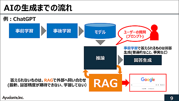生成AIに大事なことを4つ列挙したが「結局、すべてSEOであることがわかる」と江沢氏。加えて、生成AIは、すべての質問に学習済みデータだけで答えるわけではなく、最新情報やニッチな話題に対しては、「RAG(ラグ:検索拡張生成)」という仕組みで外部情報を参照する。その主な参照先の1つはGoogleの検索結果だ。つまり、Googleにインデックスされ、正しく評価されていなければ、AIの回答ソースにすら選ばれない。