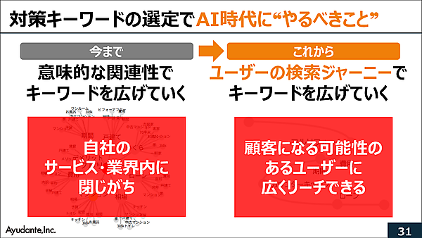 従来の手法では、メインのキーワードを軸に、意味的な関連性で言葉を広げていく、いわゆるトピッククラスターモデルが主流だった。しかし、これからはユーザーの検索ジャーニーに沿ってキーワードを広げていく必要がある。