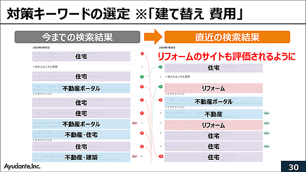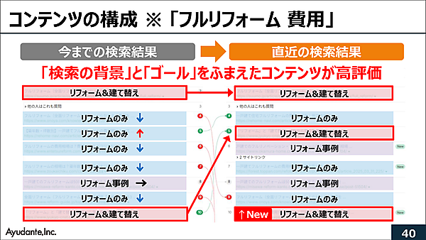 さまざまな要因があるとは思うが、検索の背景とゴールを踏まえたコンテンツのほうが、今は評価されやすくなっているように思う。最近は「建て替え」のことにも触れているコンテンツの順位が大きく上昇している一方、リフォームの内容のみに終始したコンテンツは順位が下落傾向にあった(高橋氏)