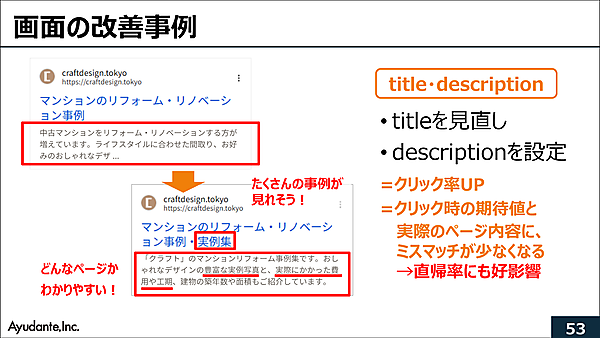 - 検索結果のCTRを上げるために、titleとdescriptionを見直す