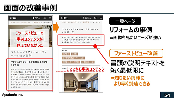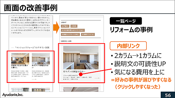 次に、検索結果から飛び先ページのファーストビューの改善だ。リフォームの事例ページを見にくるユーザーは、画像を見たいニーズが強い。改善前は、説明文がファーストビューを占め、画像が見えていない画面構成だった。説明文は最低限にし、いち早く画像を見られるようにした。さらには、人気タグや事例件数の追加によって豊富な情報があることを示し、金額情報を目立たせるといった改善を行った。