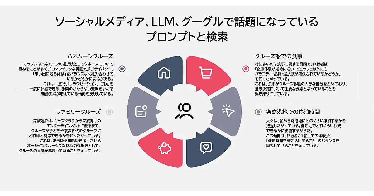 (url:reddit.com/r/Cruise OR url:reddit.com/r/Cruises) AND ("最も良い点" OR "最も悪い点")このクエリで、クルージングの最も良い点と最も悪い点をユーザーが率直に議論している会話を取り出せる。これこそ、関連性があり効果も高い施策のアイデアを生み出せるようなインサイトだ。