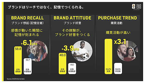 スポーツファンは、チームやスポーツそのものを自身のアイデンティティの一部とみなす傾向が強く、支援してくれるブランドを「自分たちの仲間」として受け入れる特徴があるという。またDAZNのデータによれば、同プラットフォームで広告に接触したユーザーは、そうでないユーザーと比較して、購買金額が約3倍にのぼる実績が出ている。