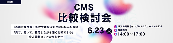 特定のテーマにおける製品・ソリューションを「見て、聞いて、質問しながら深く比較できる」少人数制のリアルイベントです。今回のテーマは、Webサイトの基盤となるCMS(コンテンツマネジメントシステム)です。