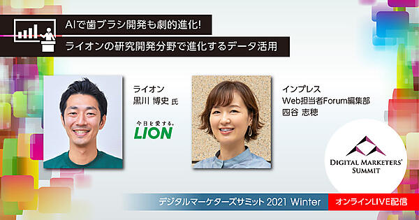 講演概要 ライオンでは「次世代ヘルスケアのリーディングカンパニーへ」を経営ビジョンに生活習慣のReDesignを実現するための取り組みとして研究開発業務でのデジタル技術の活用を進めています。本セッションでは、歯ブラシの研究開発のAI活用事例や歯磨き剤のAI活用事例、その他ロボット活用の事例などを紹介します。 内容レベル 脱初級 詳細な技術内容は紹介いたしません。ライオンの研究開発におけるデジタル技術活用を紹介いたします。製造業の従業員・研究員の生産性を高めるための気づきや視点になれば幸いです。 参加対象者 デジタル(AIやロボット)技術を担当し始めたが、領域が広く取り組み方に悩んでいる製造業における研究開発のマネジメント層、マーケティング分野意外でのデジタル技術活用を考えている方。 受講するメリット 日用品など製造業における研究開発業務でのデジタル技術活用をどう進めているか。成功と失敗のポイントについてご紹介します こんなニーズや悩みに答えられる内容です デジタル(AIやロボット)技術の社内推進担当を任せられたが、領域の特定や取り組み方に悩んでいる方の参考になる内容です。 講師プロフィール 黒川 博史 氏 2007年入社。基幹技術である油脂の基礎研究から一転、2017年よりデジタル・イノベーション・プロジェクトへ参画、イノベーションラボを経て、2019年よりデータサイエンス室長、2020年よりDX推進部長としてAI(人工知能)を中心としたデジタル技術の社内活用を推進。 四谷 志穂 大学卒業後、物流企業で営業兼Web担当者を経験。コーポレートサイトのリニューアルやデジタル広告の運用、倉庫の営業に携わる。編集未経験で2013年にインプレスに入社し、Web担当者Forumの編集者となる。1年2か月の産休育休を経て、2018年に同メディアの編集長に就任。 続きを読む | KB2-5 特別講演Bトラック 資生堂の担当者が語る! グローバルブランドのコミュニケーションプランニング ![]()