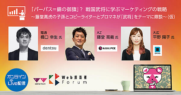 戦国時代の武将の生きざまや戦略は、現代のマーケティング思考でも共通点があり、とても役に立ちます。今回は、藤堂高虎の子孫であるAZの藤堂氏、電通のコピーライター橋口氏、大広でプロジェクトマネジメント兼コンサルタントを務める平野氏の3人が「キャリア」「コミュニケーション」「プロジェクトマネジメント」を軸にして戦国武将をテーマに鼎談。三者三様の得意領域からぞれぞれの視点で考察し、戦国武将に学ぶマーケティングの本質を視聴者と一緒に考えます。