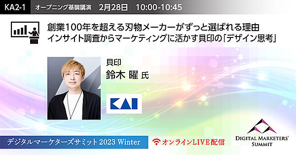 使い捨てカミソリやツメキリ、包丁など生活に密着した刃物を中心に1万点にもおよぶ商品を展開し、商品の企画開発から生産、販売まで行っている貝印。第14回日本マーケティング大賞を受賞した「#剃るに自由を」など、社会情勢やユーザーの変化に合わせたソリューションを様々な形で展開。社会の流れからインサイトを見つけ、製品をWebサイトのようにデザインして改善しながら作り上げる「デザイン思考」を取り入れている。本セッションではインサイトの見つけ方からアウトプットまでの一連の流れをご紹介。