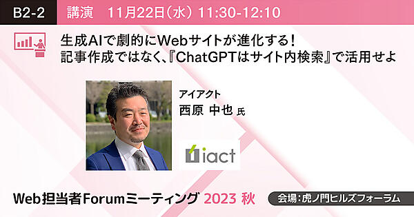 本セッションでは、すでに2桁の成功実績で今年度さらに導入が進むであろう、『ユーザ対象のChatGPT活用方法』『AIサイト内検索と連携して使う方法』をご案内します。「AI」をサイト内検索にすることでの驚きの発見、ChatGPTを併用する納得のメリット、飛躍的に変わるWebサイトについて、これまでの取組事例とデモを併せてご覧いただけます。