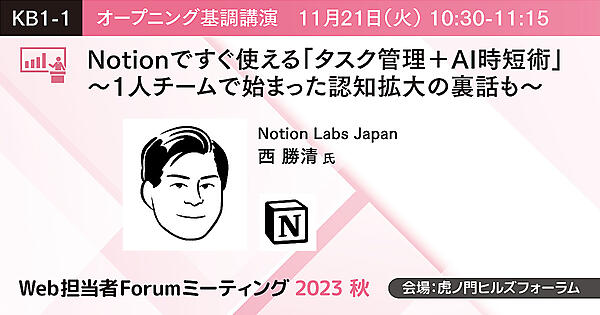 メモやタスク管理ができるコネクテッドワークスペース「Notion」ですぐに使えるテクニックや最新AIの活用方を紹介。さらに、西氏が2020年に入社してから3年間でどうやってNotionを日本で拡大していったのか、1人チームの地道な活動から現在に至るまでを解説します。