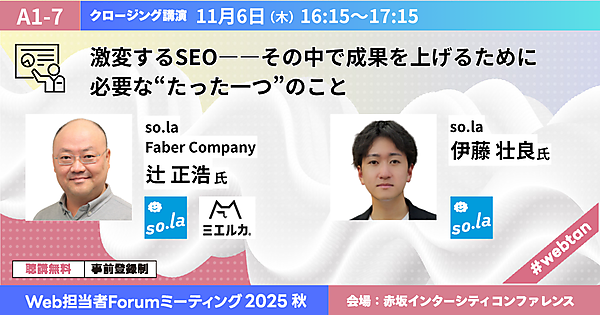 日本のWeb担当者さんに「参考になる」「役に立つ」情報をお届けするセミナーイベント「Web担当者Forum ミーティング2025 秋」を11月6日(木)~7日(金)の2日間にわたり開催します。今年の会場は「赤坂インターシティコンファレンス」です。